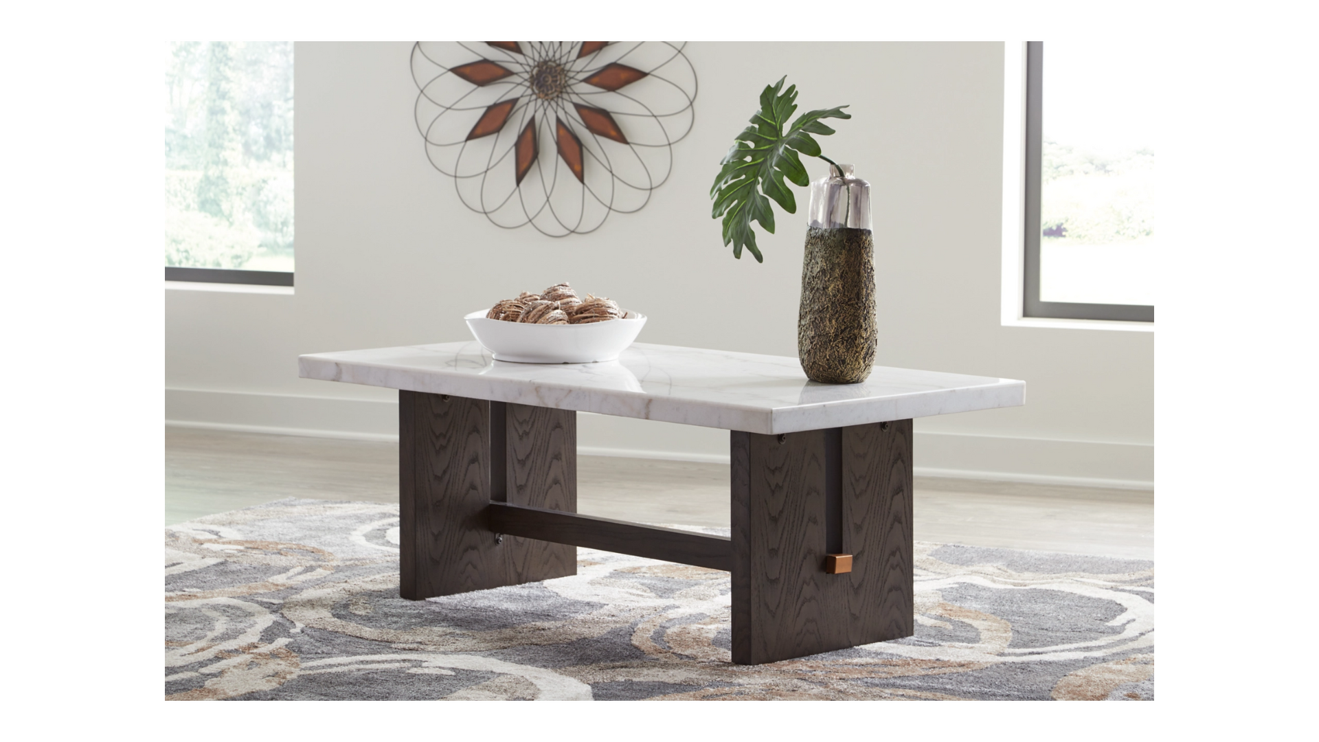 Dressed to thrill, the simply stunning Burkhaus coffee table offers a high-design look at a down-to-earth price. Ultra-sleek lines are accentuated with a dark waxy brown oak finish that’s so easy on the eyes. Clean-lined and modern, the plinth base and natural marble tabletop showcase quality craftsmanship and attention to detail. This table is the perfect centerpiece for a living room or family space, with a timeless look that's made to last.