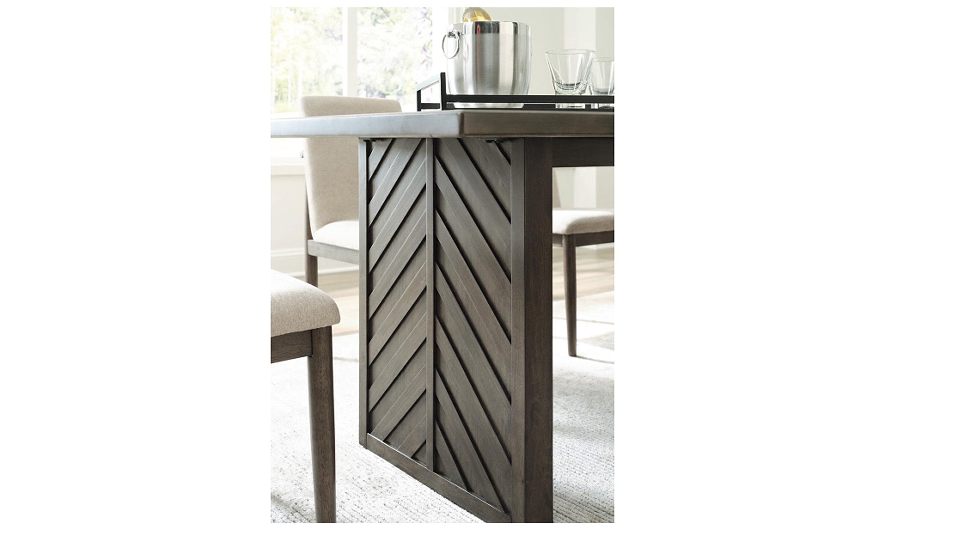 The Arkenton dining package has all the right ingredients for modern design done to perfection. It’s beautifully crafted with wood, mango veneer and engineered wood. A complex grayish brown finish and ribbed detailing add a contemporary edge.