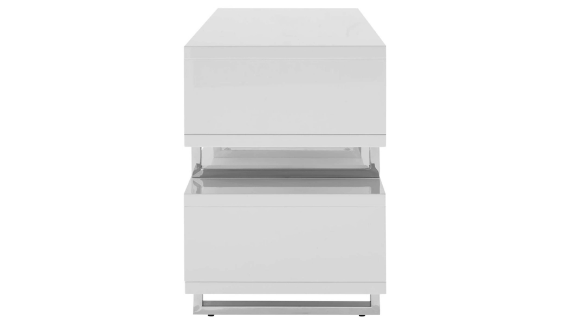Add a balanced presence to your living room with the Amble TV stand. Its open design adds dimension, while the crisp white melamine surface and polished stainless steel supports create a sleek modern look. Display your TV, books and accents with this contemporary piece.