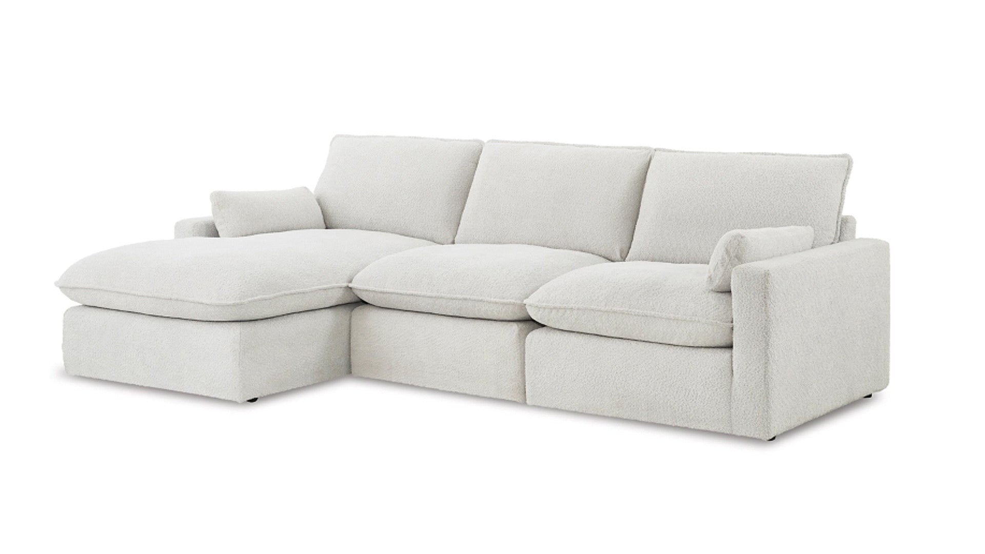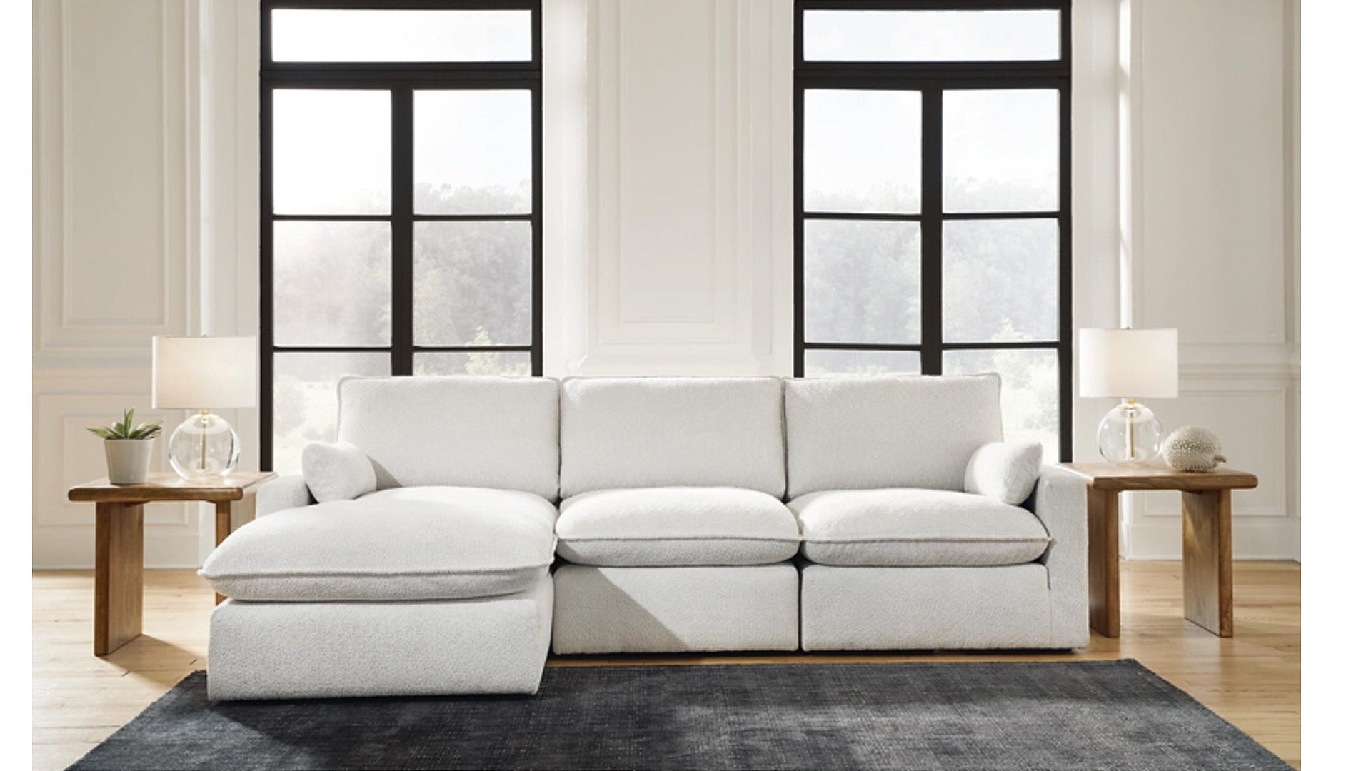 Kick back in blissful comfort with the boldly designed Gimma sectional sofa with chaise. Its neutral upholstery gets a deliciously dramatic twist with flange welting and a boucle-like weave on the fabric. Plush feather-fiber blend cushions, deep seats and on-trend track arms merge cozy seating with a contemporary aesthetic.