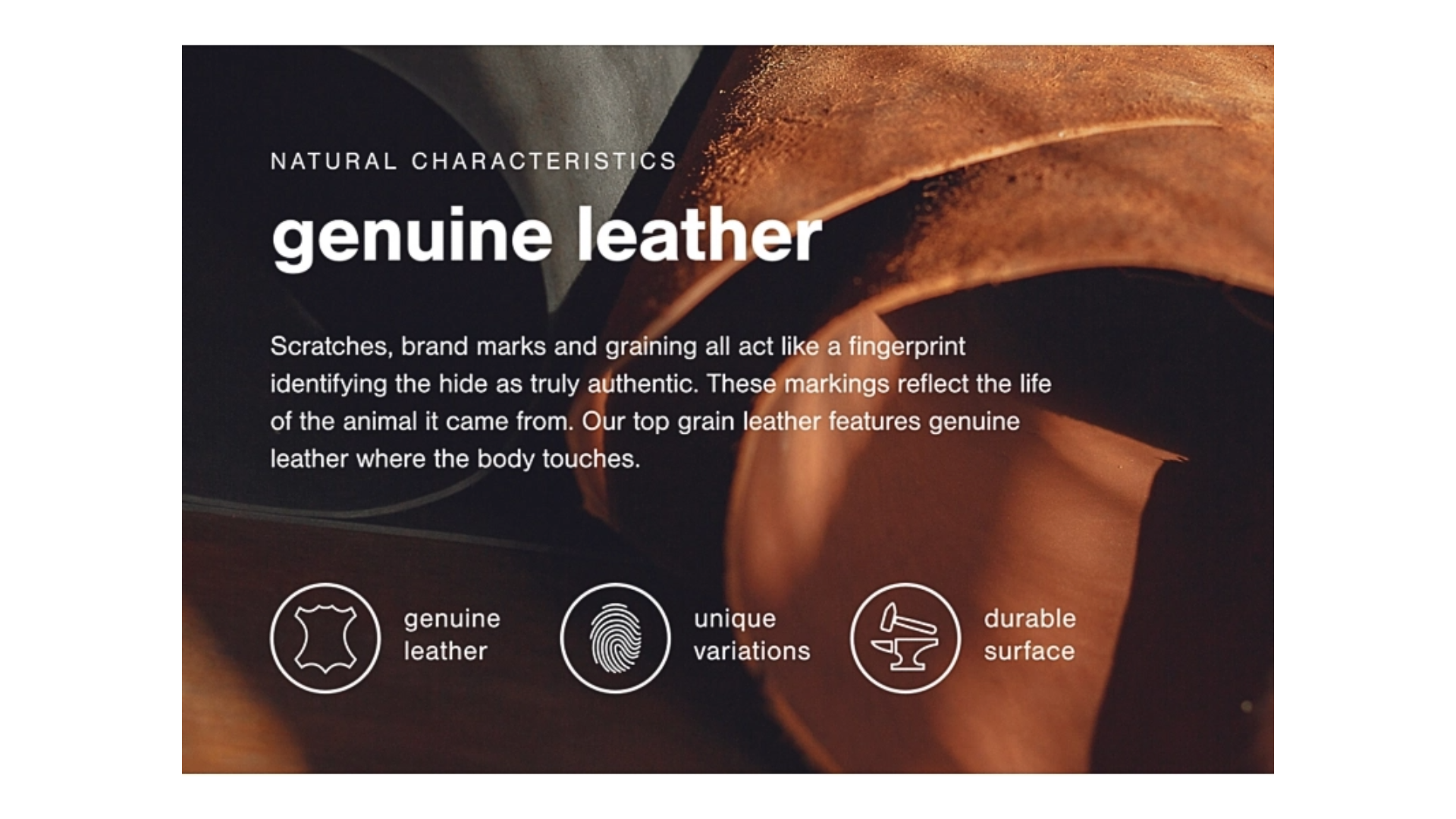 - Due to its natural origin, real leather can show individual characteristics such as healed scars, growth marks, grain variation and shade variation