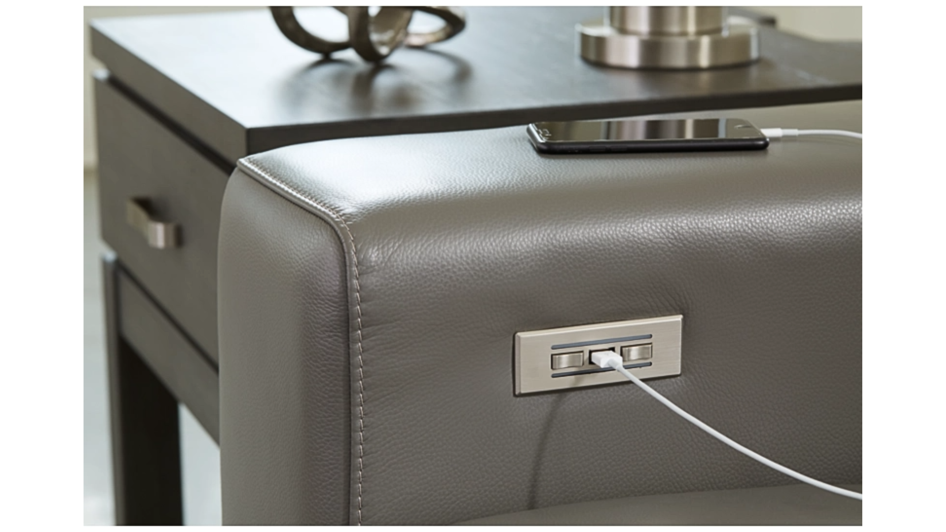 Truly putting high design into recline, the Texline sofa with gray leather match upholstery proves that just because you’re a recliner doesn’t mean you have to look like one. Deceptively beautiful, its ultra clean-lined aesthetic is as cool and contemporary as they come. Low-profile back has a super swank look. When you need more support for your head and neck, the press of a button engages the Easy View™ power adjustable headrest, designed to let you lean back and still have a primo view of the TV. The zero wall design requires minimal space between wall and chair back, and indulgent pillow top seating gives an added layer of comfort.